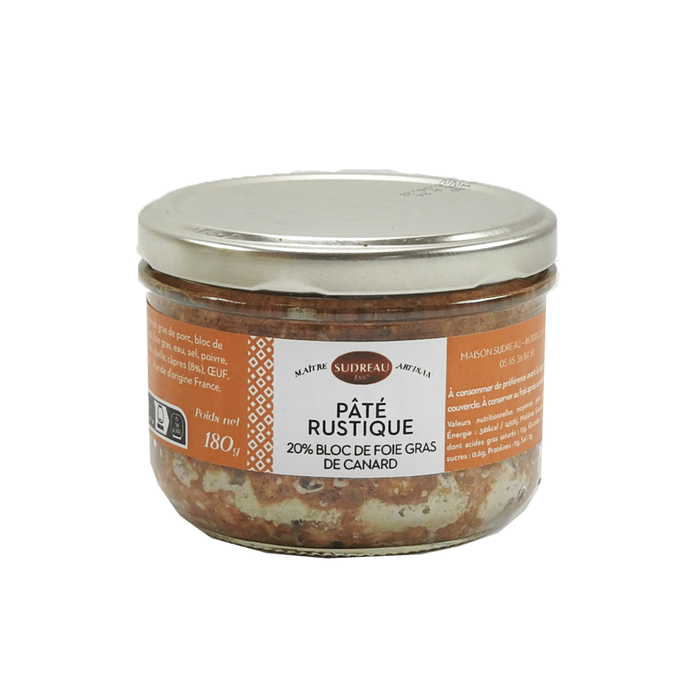 Ingrédients : Maigre et gras de porc, bloc de foie gras de canard (foie gras, eau, sel, poivre, sucre) 20%, foie de volaille, câpres (8%), OEUF, sel, poivre, épices . Viande d’origine France.
